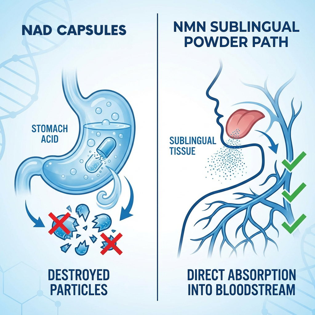 When you swallow NMN capsules, stomach acid destroys most of the NMN before your body can use it. Studies show absorption rates as low as 30%.