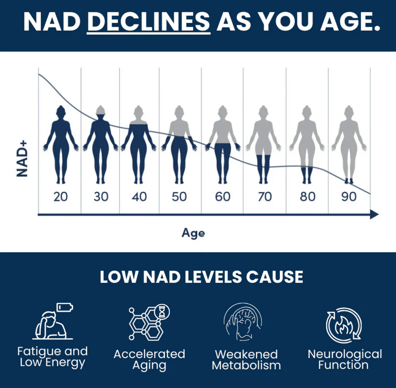 Here's the problem: NAD+ levels decline 50% by age 50. This is why you don't have the energy you had at 30. It's not "just getting older." It's a specific, measurable cellular change.