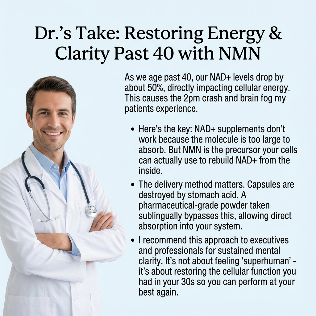"My Doctor Was Impressed" "Showed my doctor the research. He was skeptical but intrigued. After my latest physical with improved metabolic markers and me reporting dramatically better energy, he said 'keep doing whatever you're doing.' Now he's researching NAD+ for his other patients.