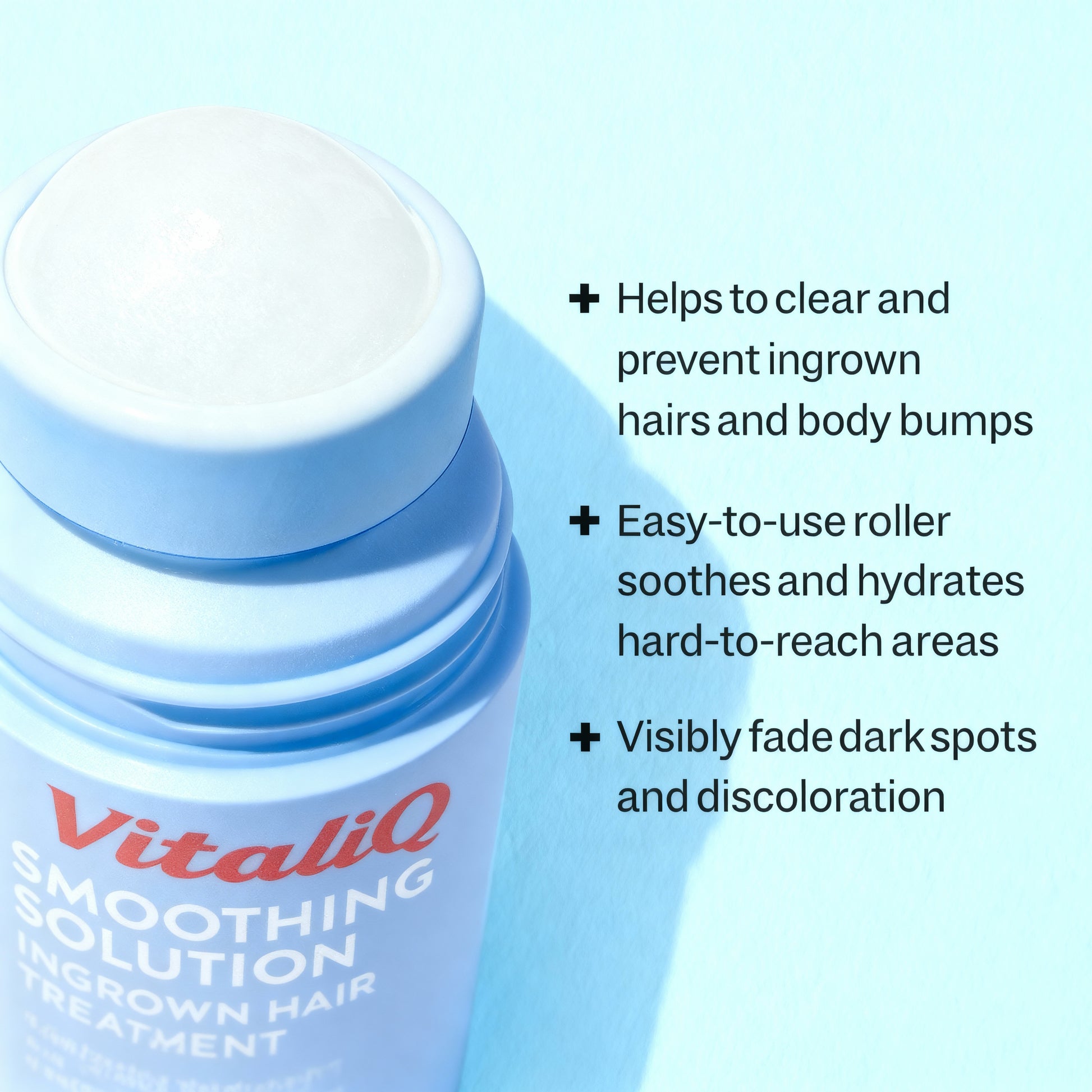 Daily VitaliQ light chemical exfoliation to clear the path + soothing hydration to keep skin supple (so hairs don’t curl back).